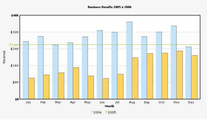 | <graph caption='Business Results 2005 v 2006' xAxisName='Month' yAxisName='Revenue' showValues='0' numberPrefix='$' decimalPrecision='0' bgcolor='F3f3f3' bgAlpha='70' showColumnShadow='1' divlinecolor='c5c5c5' divLineAlpha='60' showAlternateHGridColor='1' alternateHGridColor='f8f8f8' alternateHGridAlpha='60' > <categories> <category name='Jan' /> <category name='Feb' /> <category name='Mar' /> <category name='Apr' /> <category name='May' /> <category name='Jun' /> <category name='Jul' /> <category name='Aug' /> <category name='Sep' /> <category name='Oct' /> <category name='Nov' /> <category name='Dec' /> </categories> <dataset seriesName='2006' color='c4e3f7' > <set value='27400' /> <set value='29800' /> <set value='25800' /> <set value='26800' /> <set value='29600' /> <set value='32600' /> <set value='31800' /> <set value='36700' /> <set value='29700' /> <set value='31900' /> <set value='34800' /> <set value='24800' /> </dataset> <dataset seriesName='2005' color='Fad35e' > <set value='10000'/> <set value='11500'/> <set value='12500'/> <set value='15000'/> <set value='11000' /> <set value='9800' /> <set value='11800' /> <set value='19700' /> <set value='21700' /> <set value='21900' /> <set value='22900' /> <set value='20800' /> </dataset> <trendlines> <line startValue='26000' color='91C728' displayValue='Target' showOnTop='1'/> </trendlines> </graph> |
