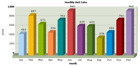 Let's now get to building our first example. In this example, we'll create a "Monthly Unit Sales" chart using dataURL method. For a start, we'll hard code our XML data in a physical XML document Data.xml and then utilize it for our chart.